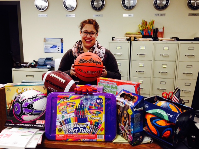In 2014, Assets International ran a toy collection drive from all the businesses in our building. Rhonda Mason displays a sample of what we collected in December of that year, to be turned over to The Rainbow Connection.